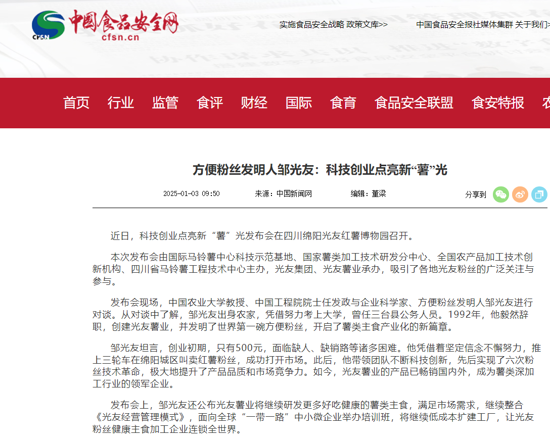 轉(zhuǎn)載中國食品安全網(wǎng)——方便粉絲發(fā)明人鄒光友:科技創(chuàng)業(yè)點(diǎn)亮新“薯”光